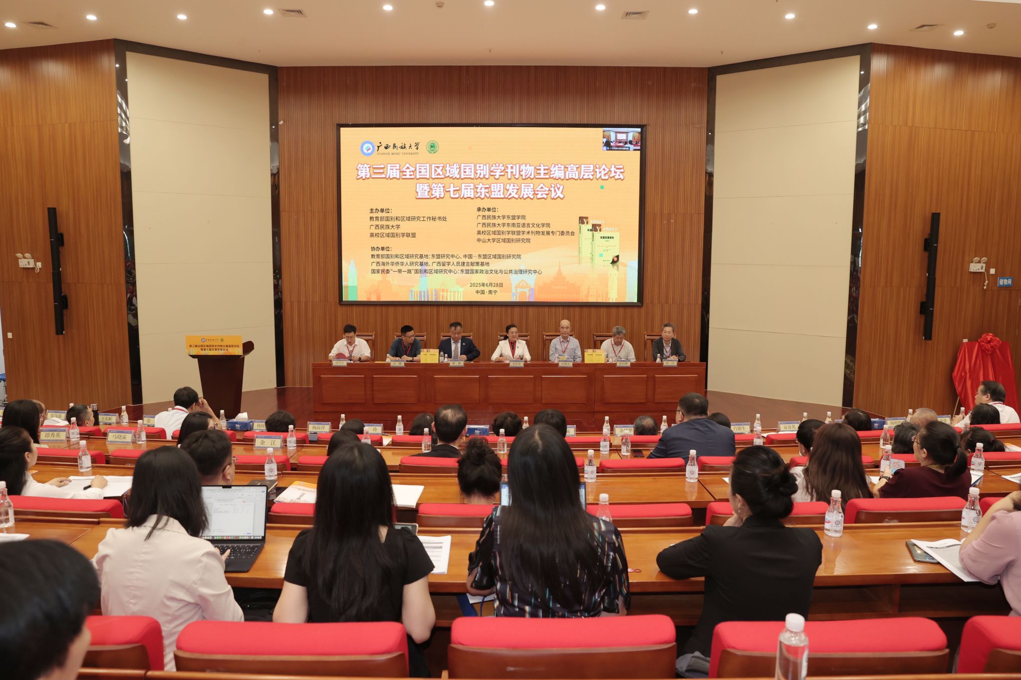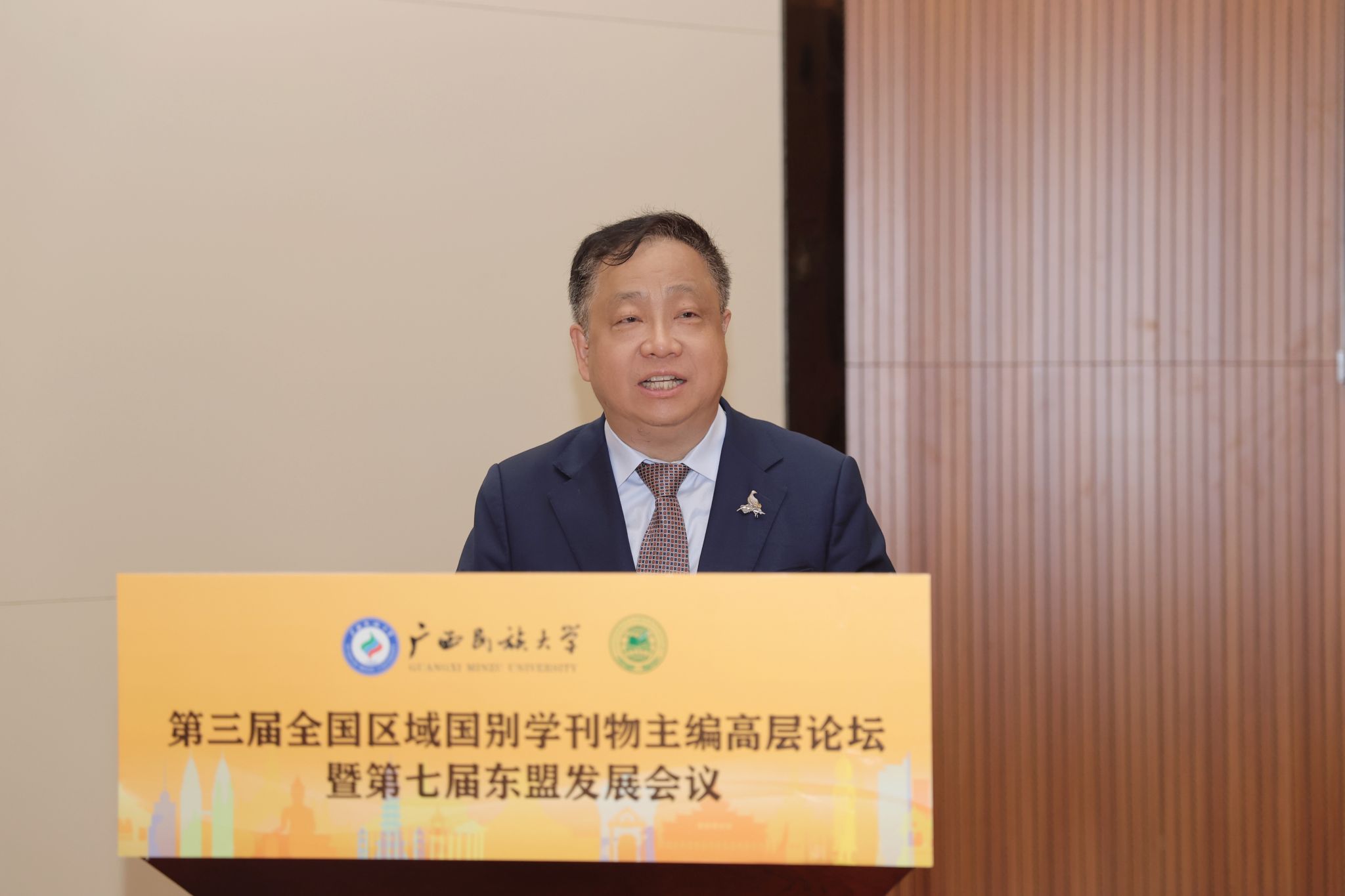 【大學生通訊社報道】6月28日,第三屆全國區域國別學刊物主編高層論壇暨第七屆東盟發展會議在廣西民族大學思源湖校區圖書館報告廳舉行。廣西民族大學校長韋仕珍,教育部國別和區域研究工作秘書處主任、高校區域國別學聯盟學術委員會主席羅林出席會議并致辭。高校區域國別學聯盟秘書長、中山大學區域國別研究院院長陳杰,天津商業大學副校長余江,上海社會科學院《史林》主編、歷史研究所所長郭長剛,上海社會科學院《國際關系研究》主編、國際問題研究所所長王健,《南洋問題研究》主編、廈門大學國際關系學院/南洋問題研究院教授、廣西民族大學“八桂學者”莊國土以及國內高等院校和科研機構專家學者參加會議。廣西民族大學副校長高興宇主持開幕式。