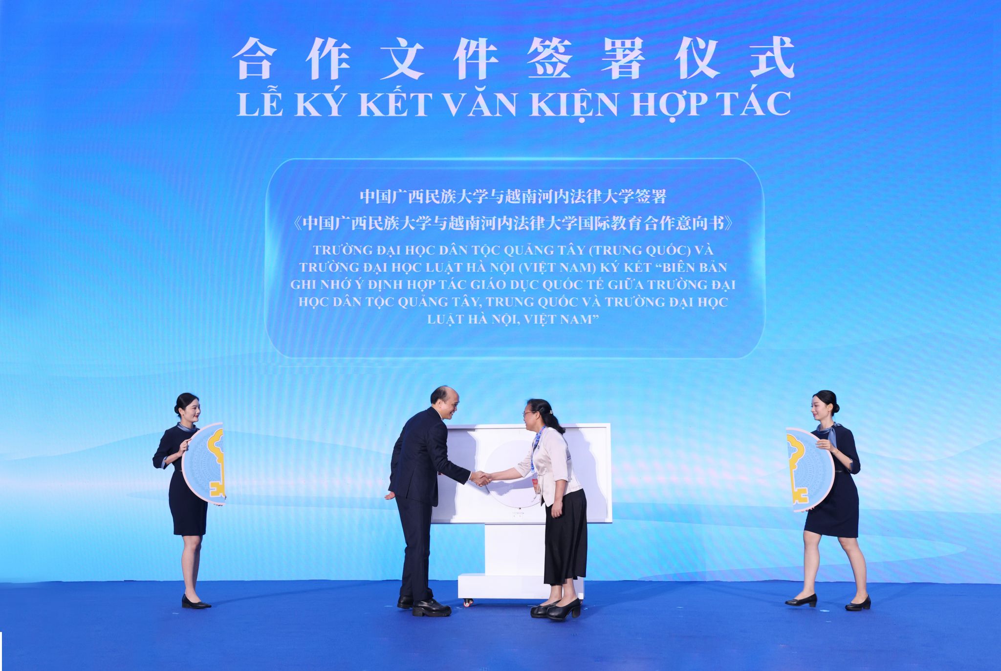 廣西民族大學(xué)校長韋仕珍出席會晤活動,并與越南河內(nèi)法律大學(xué)簽署《中國廣西民族大學(xué)與越南河內(nèi)法律大學(xué)國際教育合作意向書》。根據(jù)協(xié)議,雙方將在師生交流交換、聯(lián)合研究與教學(xué)活動、短期研修項目等領(lǐng)域展開合作,共同探索中越兩國法學(xué)教育合作新模式,促進(jìn)兩校法學(xué)人才培養(yǎng)與學(xué)術(shù)交流邁向新臺階。